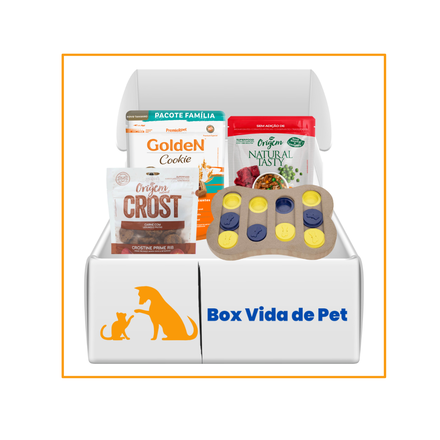 Receba uma caixa personalizada para o seu pet com 4 itens variados, escolhidos com carinho! A seleção pode incluir brinquedos, petiscos, alimentos úmidos, acessórios e produtos de higiene. Assinatura com renovação automática.